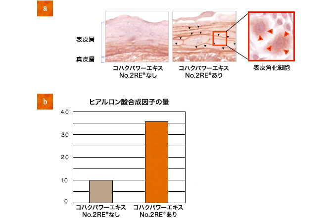 さらにこのヒアルロン酸産生促進メカニズムを調べたところ、表皮角化細胞においてコハクパワーエキスNo.2RERはヒアルロン酸合成因子の量を対照として用いたコハクパワーエキスNo.2RERなしと比較して約3.5倍上昇させることがわかりました(b)。